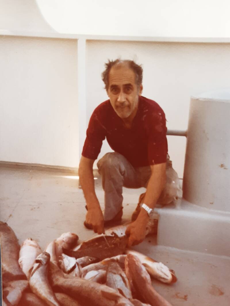 Vis ruilen voor bier en sigaretten met een spaanse trawler. Manuel de 3e machinist maakt de net gevangen vis schoon.